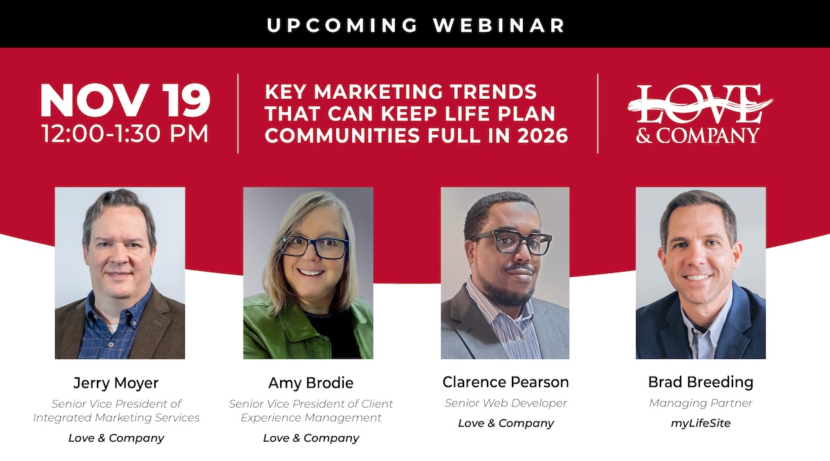 Drawing from both our own highly experienced marketing, sales, research and development planning specialists, and from a broad range of senior living professionals from throughout the field, Love & Company provides an ongoing stream of educational content that enables community leadership to stay on the cutting edge of senior living.