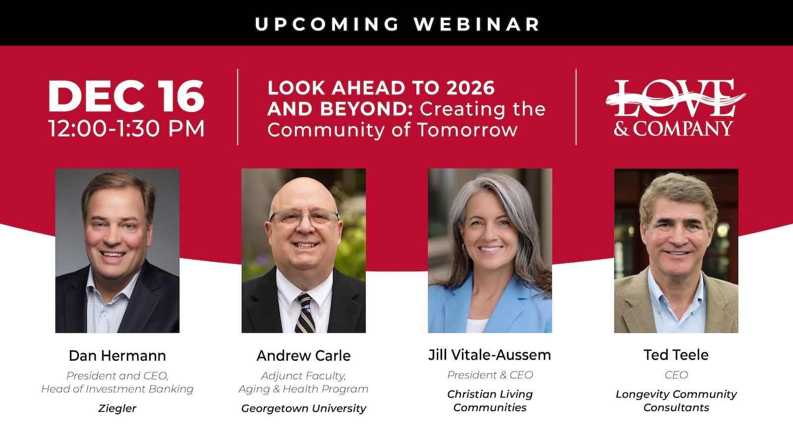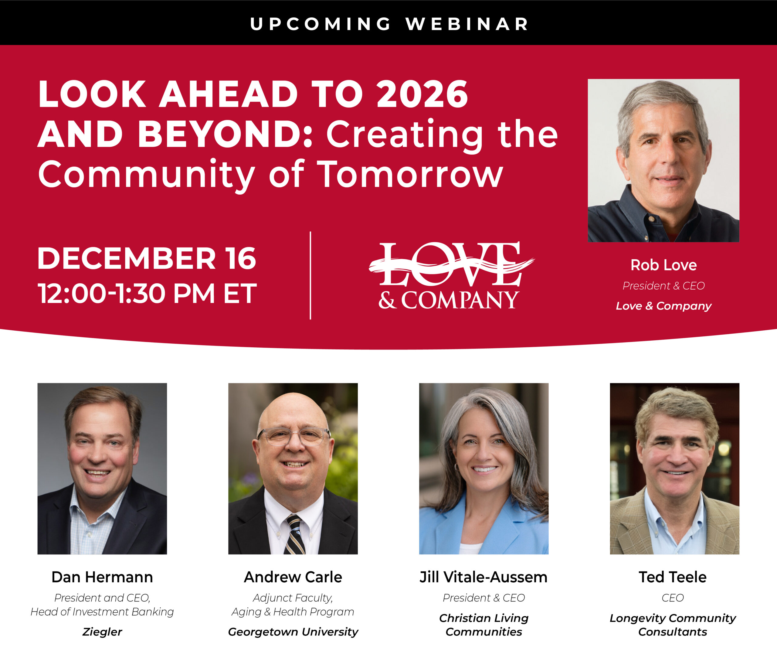 Join us for our sixth annual “A Look Ahead” webinar, as we explore how to create the community of tomorrow, so we can meet the growing needs of our markets while sustaining our missions. This interactive session will bring together thought leaders to provide insights into how and why the traditional Life Plan Community needs to evolve, examples of what these changes can look like and steps you can take to start exploring this transformation at your own organization.